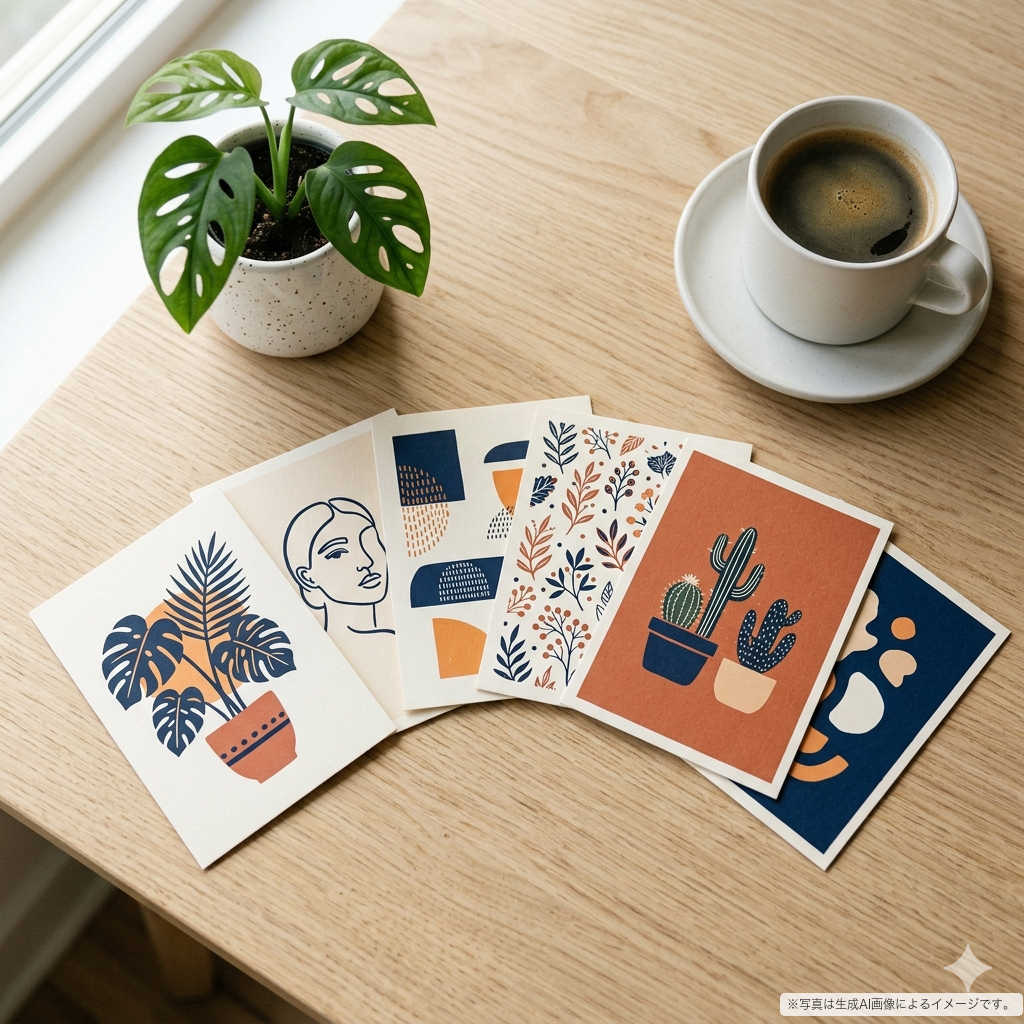 DM・案内状・ショップカード・サンクスカードに。はがき・A6・A5サイズ対応。厚手用紙でしっかりした手触り、小ロットでも1枚ずつ丁寧に印刷。10枚から送料無料・最短2営業日で出荷。