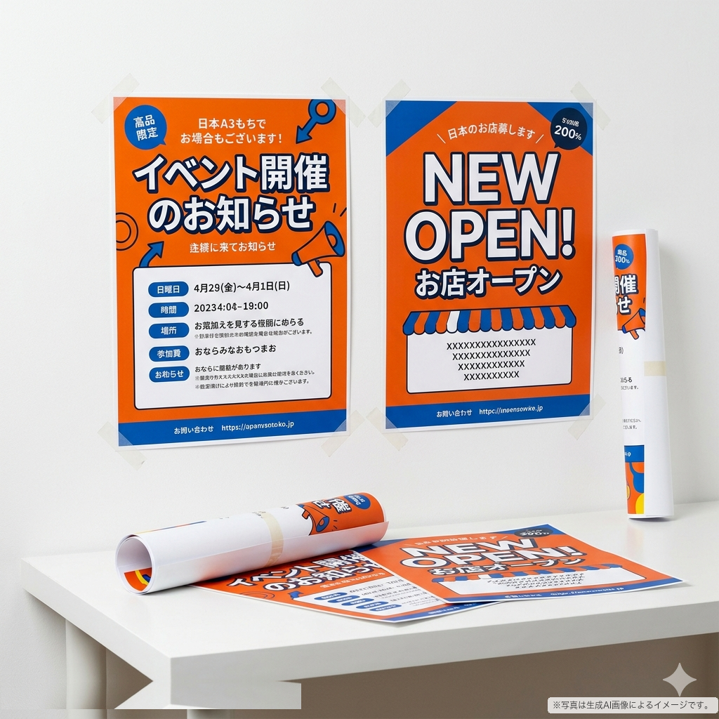 イベント告知・店頭POP・展示会パネルに。A3〜A5・B4・B5サイズのオンデマンド印刷で、1枚から注文OK。必要な分だけ、送料無料・最短3営業日で出荷。